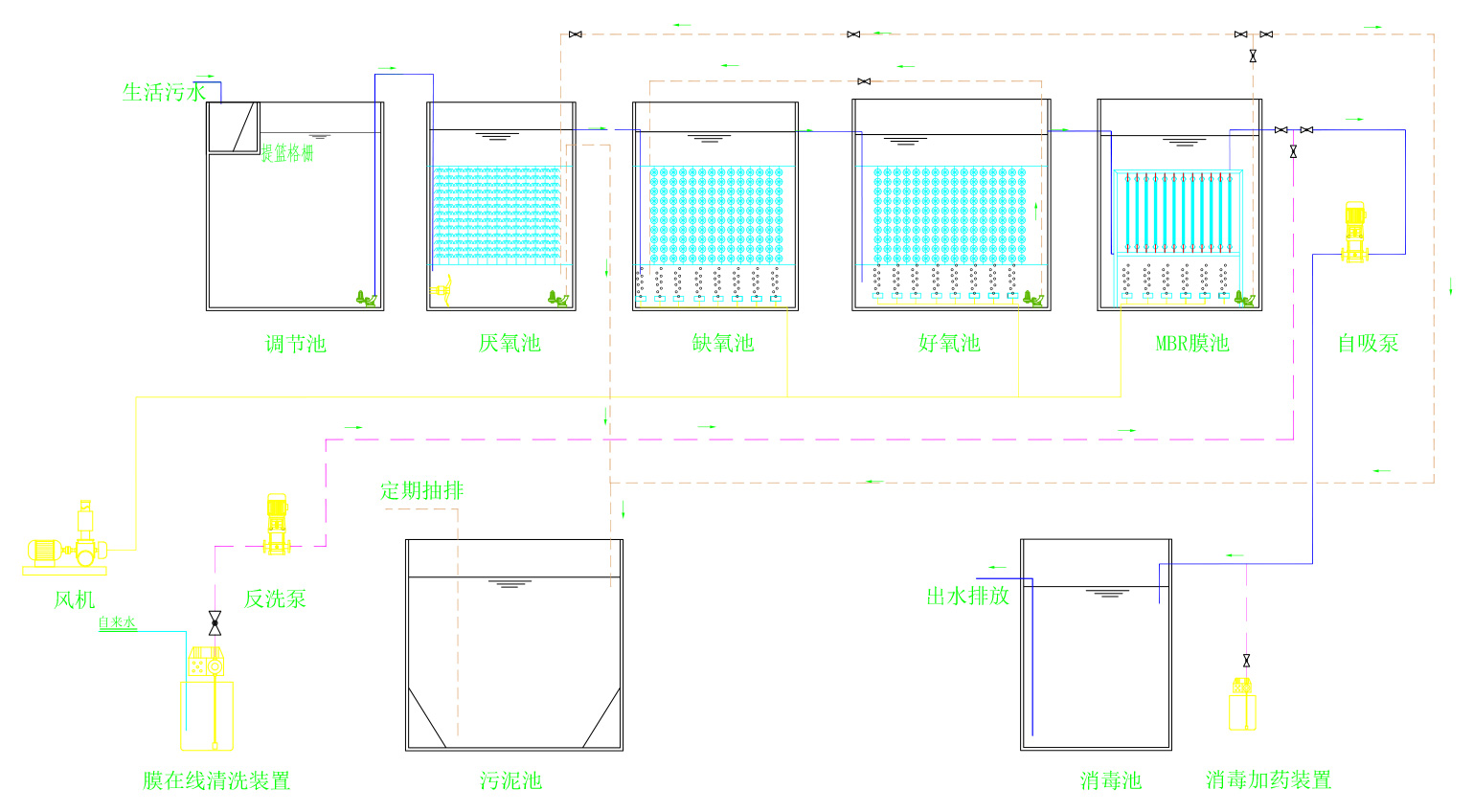 污水經(jīng)格柵去除較大的懸浮物后進(jìn)入調(diào)節(jié)池,在調(diào)節(jié)池內(nèi)對(duì)水質(zhì)水量進(jìn)行調(diào)節(jié)。調(diào)節(jié)池內(nèi)的污水經(jīng)提升泵出水厭氧池中,在厭氧菌環(huán)境下,聚磷菌釋放磷,并吸收低級(jí)脂肪酸等易降解的有機(jī)物,出水及好氧池內(nèi)回流的污水一同進(jìn)入缺氧池進(jìn)行反硝化反應(yīng),反硝化細(xì)菌將硝酸鹽通過反硝化作用,轉(zhuǎn)化成氮?dú)?,達(dá)到脫氮目的。出水自流至好氧池中,在好氧池中,好氧菌通過硝化細(xì)菌將入流中的氨氮及有機(jī)氨氮轉(zhuǎn)化成硝酸鹽,同時(shí)聚磷菌過量的吸收磷,磷以過剩污泥的形式去除,在此過程大量的有機(jī)污染物被去除。出水自流進(jìn)入MBR膜池,進(jìn)行進(jìn)一步的生化,懸浮物和濁度接近于零,細(xì)菌和病毒被大幅去除,出水自流進(jìn)入清水池中消毒,出水達(dá)標(biāo)排放。