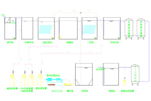 酸洗廢水經(jīng)格柵去除大的懸浮物后進(jìn)入調(diào)節(jié)池,在調(diào)節(jié)池內(nèi)對(duì)水質(zhì)水量進(jìn)行調(diào)節(jié)。調(diào)節(jié)池內(nèi)的污水經(jīng)提升泵進(jìn)入PH調(diào)節(jié)池,池內(nèi)投加堿,將pH調(diào)節(jié)至11,污水發(fā)生沉淀反應(yīng),自流進(jìn)入一級(jí)沉淀池中,大量重金屬污染物被去除,出水進(jìn)入混凝池,通過投加聚合氯化鋁(PAC)、聚丙烯酰胺(PAM)藥劑,使污水進(jìn)行絮凝反應(yīng),在二沉池中沉淀,進(jìn)一步去除水中污染物,上清液溢流至中間水池,通過加酸,將pH調(diào)節(jié)至7.5,經(jīng)加壓泵進(jìn)入石英砂過濾器、活性炭過濾器,經(jīng)過石英砂及活性炭的過濾吸附作用,去除部分污染物,懸浮物和濁度接近于零,在經(jīng)過離子交換樹脂,將大部分污染物攔截,出水進(jìn)入清水池,通過消毒藥劑進(jìn)行消毒后,達(dá)標(biāo)排放。
